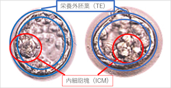 将来、赤ちゃんになる内細胞塊(ICM)、胎盤になる栄養外胚葉(TE)に分かれます。それぞれの細胞の状態について、細胞数が多いか細胞同士が密に接着しているかで評価を行います。良好胚盤胞については凍結、または移植を行います。発生速度の遅い胚については、受精6日目、7日目まで培養を続け凍結することもあります。