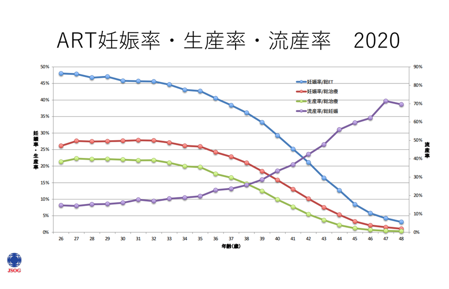 上記のように、現状で最も妊娠率の高い治療法である体外受精でも、年齢の上昇とともに妊娠率は低下し、一方で流産率は上昇します。35歳くらいからその傾向は顕著になります。40代になると生産率(実際に赤ちゃんを出産できる確率)は10%以下になります。